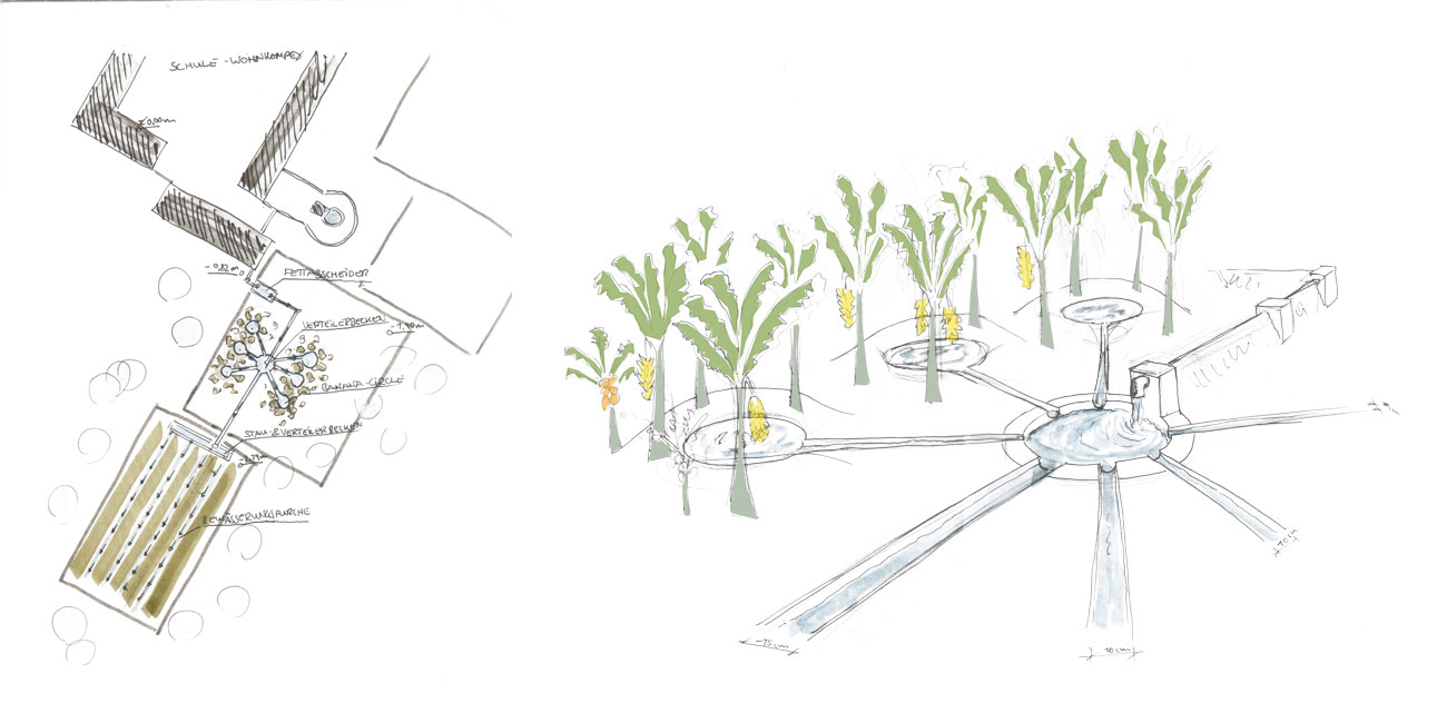 In addition to the construction of a washing area with lockable taps and controlled drainage via closed sewage pipes, the concept also provides for the use of gray water to cultivate the school’s own kitchen garden. First, the water is to be filtered through a grease trap before being passed on to so-called banana circles, where it is used to irrigate bananas and papayas. The remaining water flows into a reservoir, which can be opened via furrows in the ground to irrigate a field. In this way, water consumption can be reduced through more efficient fresh water management and the waste water can be used sensibly to cultivate agricultural land.